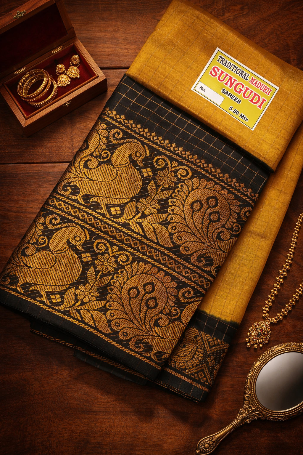 Timeless, elegant, and effortlessly festive — the Fancy Checks in Mustard Yellow and Black is a saree that strikes the perfect balance between traditional and contemporary. The warm Mustard Yellow body with a double-side gold zari border and a classic Black blouse creates a look that's both grounded and graceful.